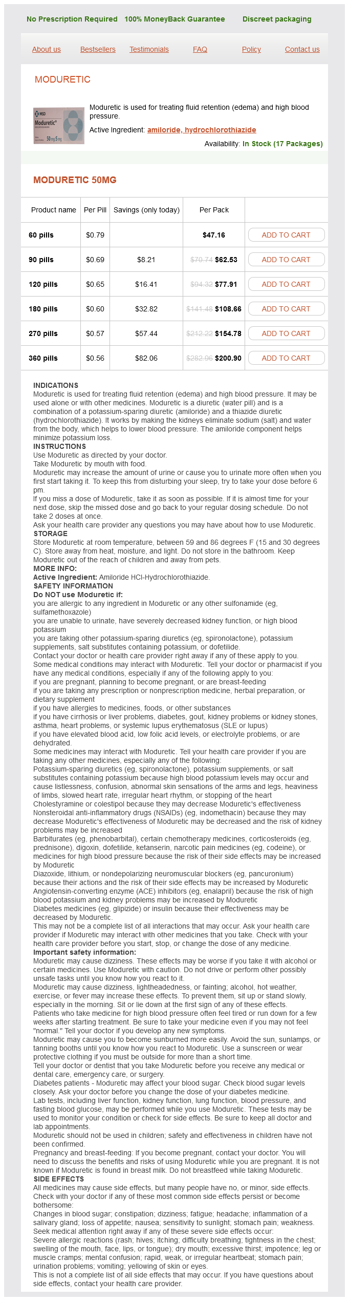 Moduretic packs: 60 pills, 90 pills, 120 pills, 180 pills, 270 pills, 360 pills
