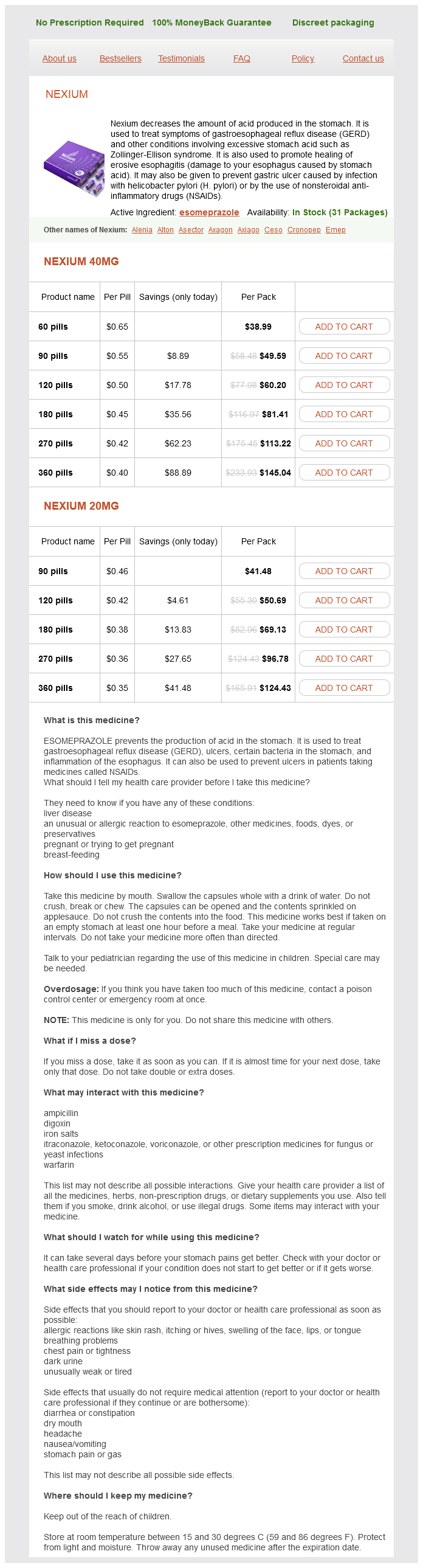 Nexium packs: 60 pills, 90 pills, 120 pills, 180 pills, 270 pills, 360 pills