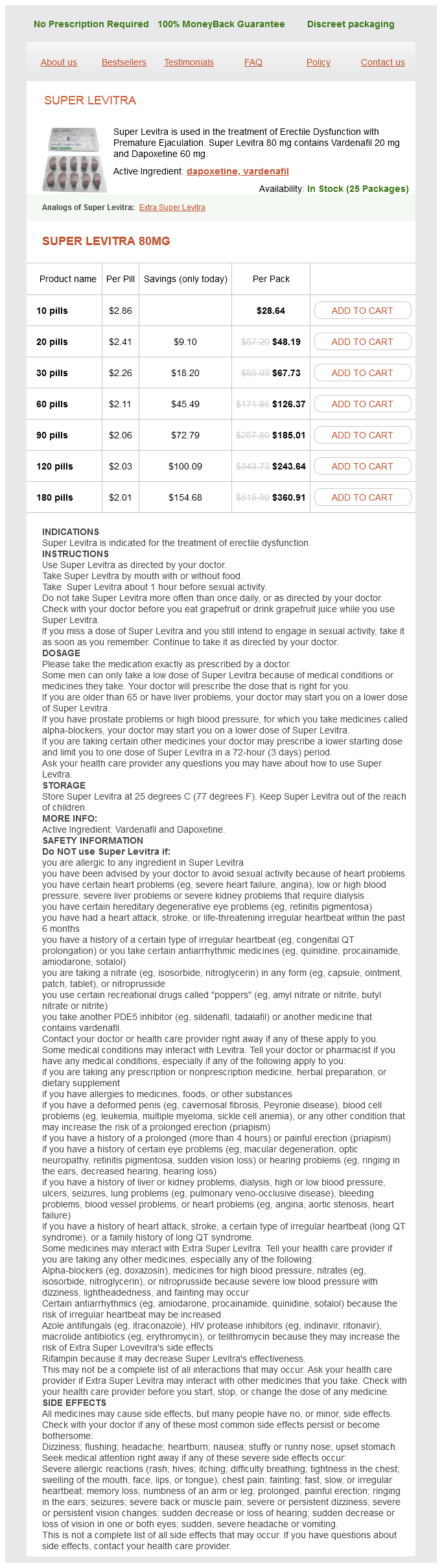 Super Levitra packs: 10 pills, 20 pills, 30 pills, 60 pills, 90 pills, 120 pills, 180 pills