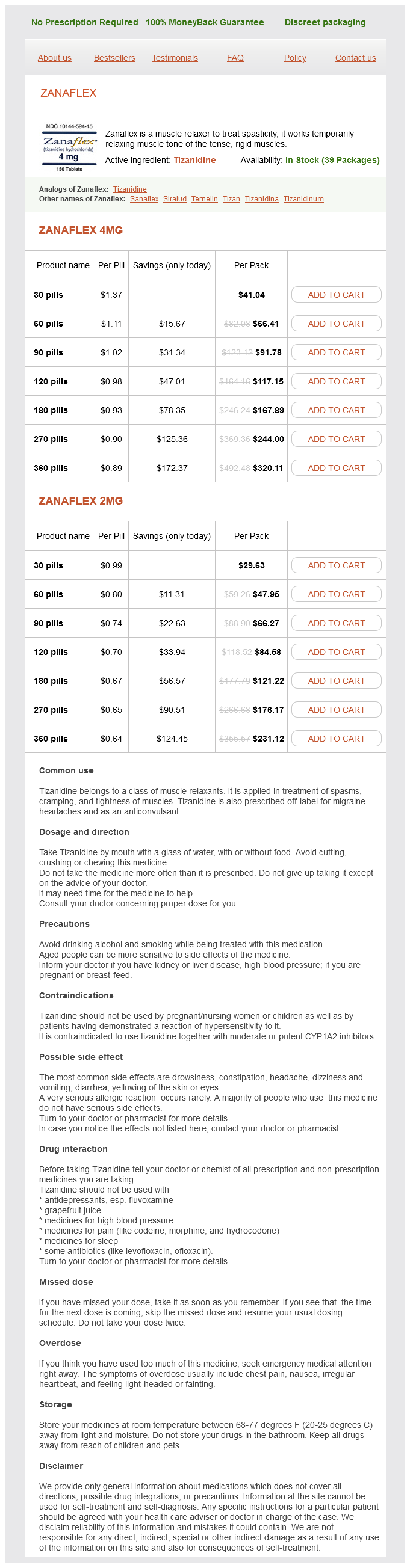 Tizanidine packs: 30 pills, 60 pills, 90 pills, 120 pills, 180 pills, 270 pills, 360 pills