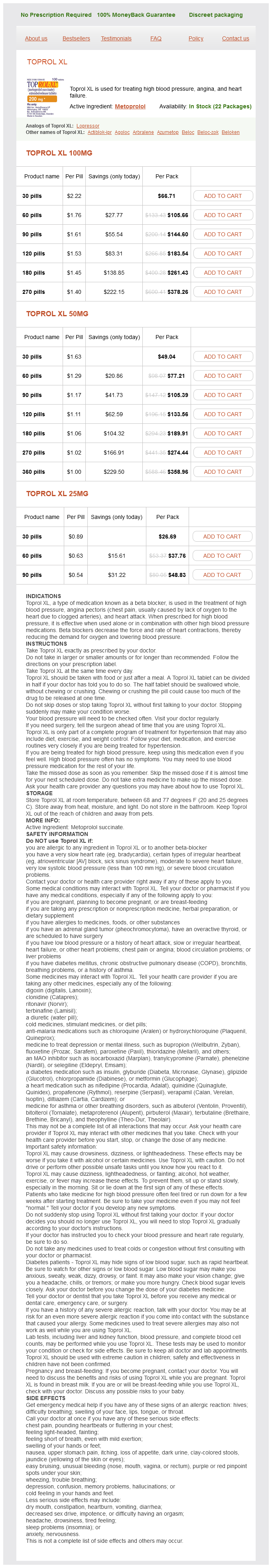 Toprol XL packs: 30 pills, 60 pills, 90 pills, 120 pills, 180 pills, 270 pills, 360 pills