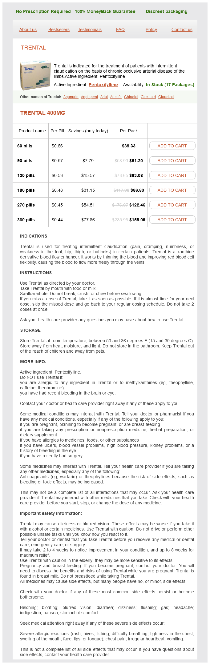 Trental packs: 60 pills, 90 pills, 120 pills, 180 pills, 270 pills, 360 pills