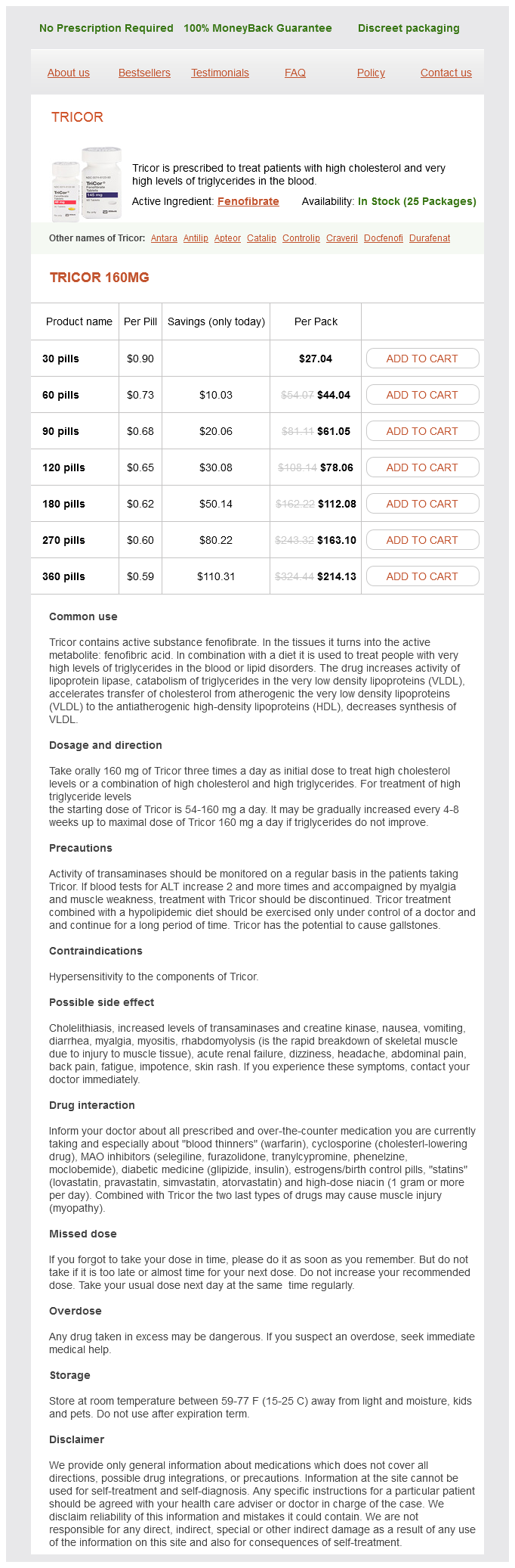 Tricor packs: 30 pills, 60 pills, 90 pills, 120 pills, 180 pills, 270 pills, 360 pills