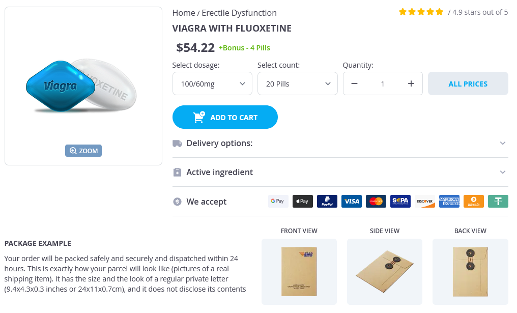 Viagra with Fluoxetine packs: 20 pills, 30 pills, 60 pills, 90 pills, 120 pills, 180 pills, 270 pills