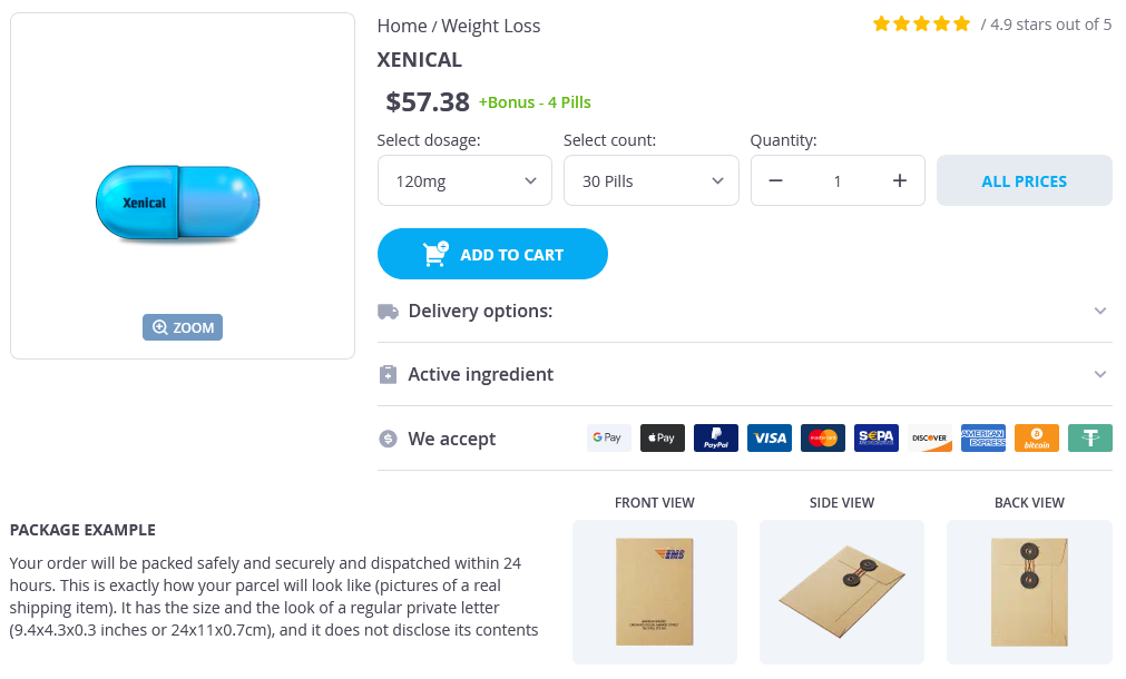Xenical packs: 30 pills, 60 pills, 90 pills, 120 pills, 180 pills, 270 pills