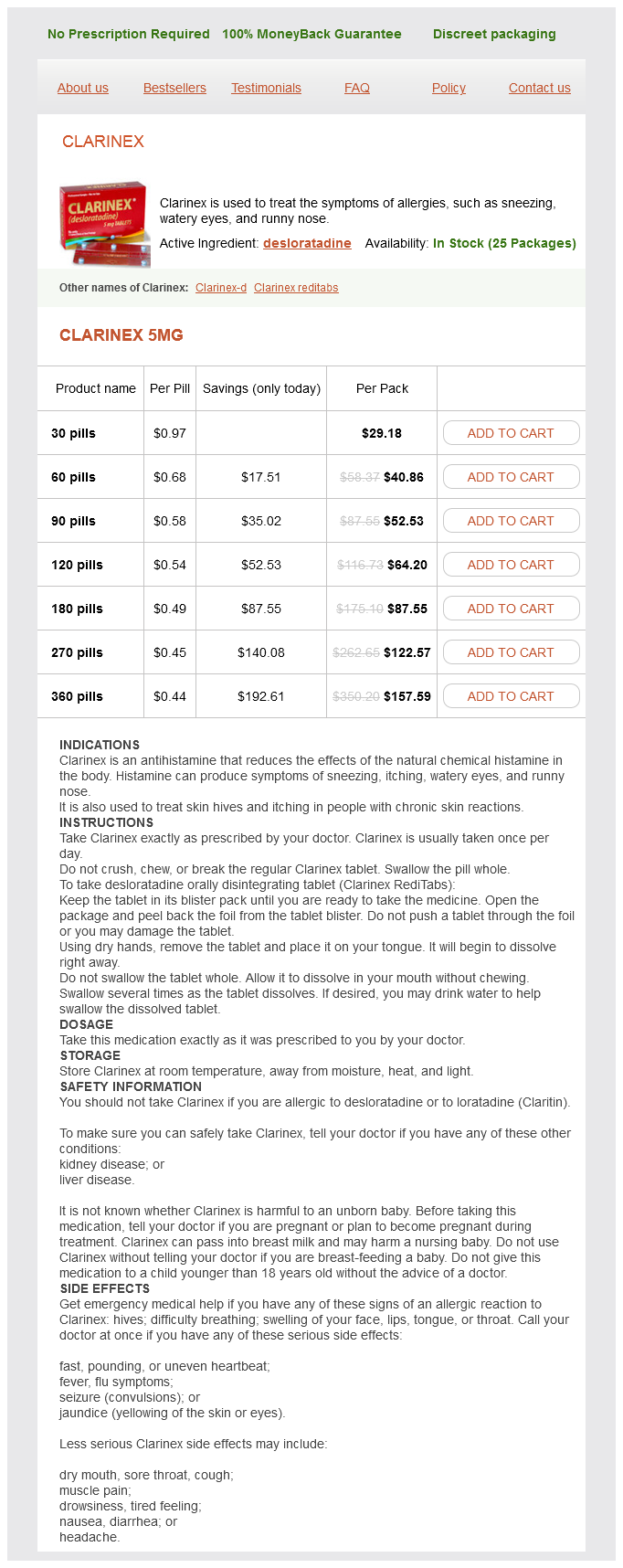 Desloratadine packs: 30 pills, 60 pills, 90 pills, 120 pills, 180 pills, 270 pills, 360 pills