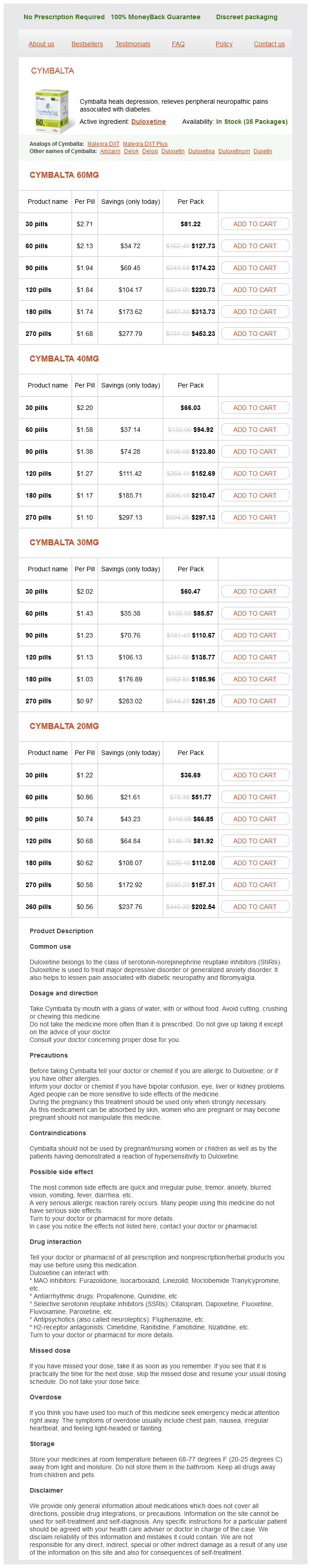 Duloxetine packs: 30 pills, 60 pills, 90 pills, 120 pills, 180 pills, 270 pills, 360 pills
