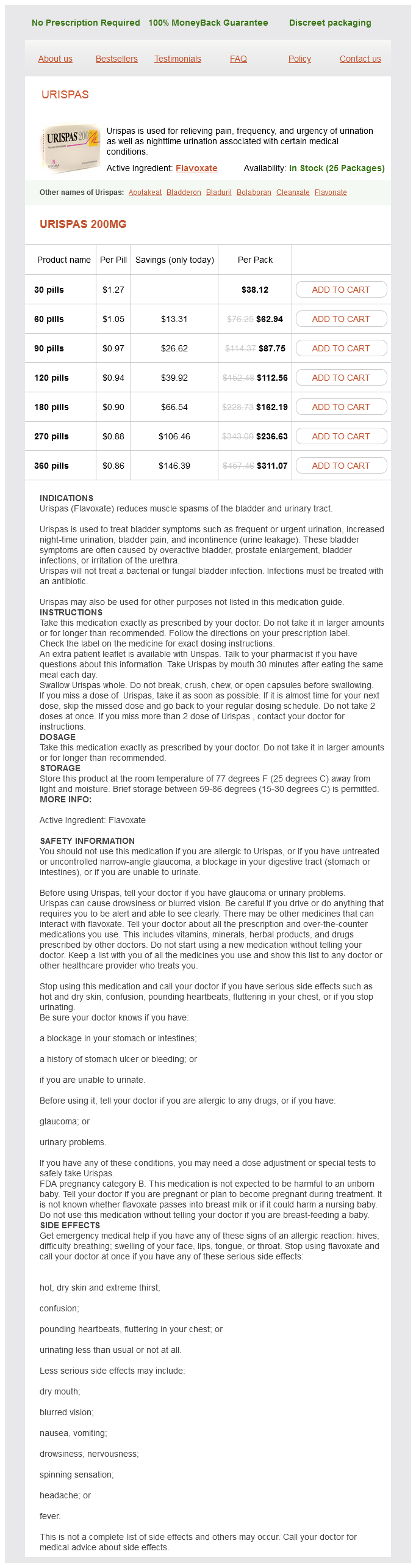 Flavoxate packs: 30 pills, 60 pills, 90 pills, 120 pills, 180 pills, 270 pills, 360 pills