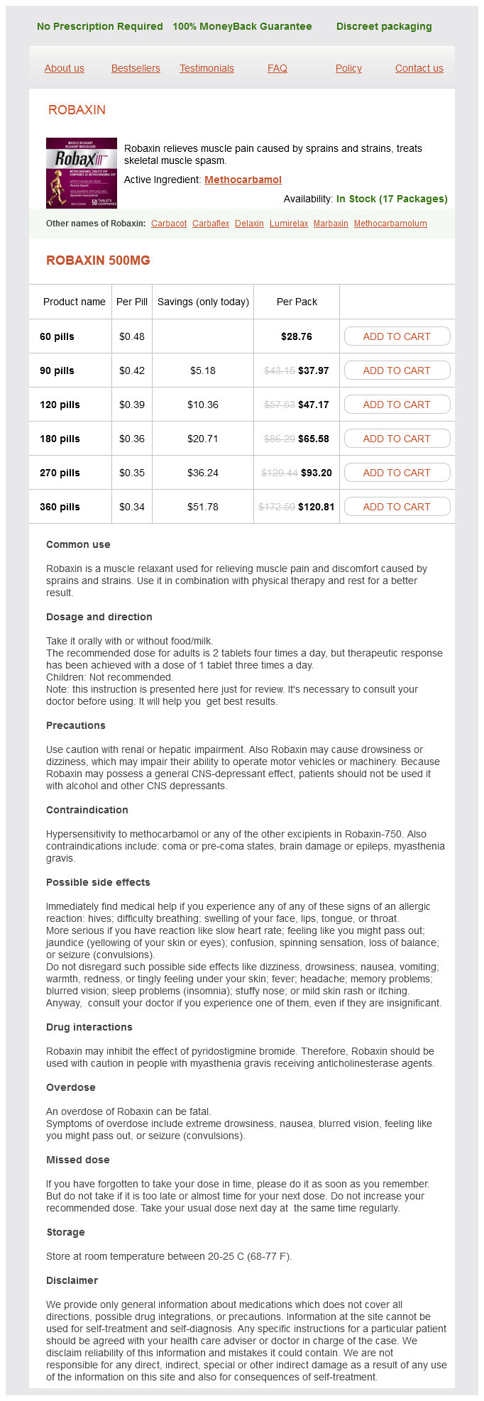 Methocarbamol packs: 60 pills, 90 pills, 120 pills, 180 pills, 270 pills, 360 pills