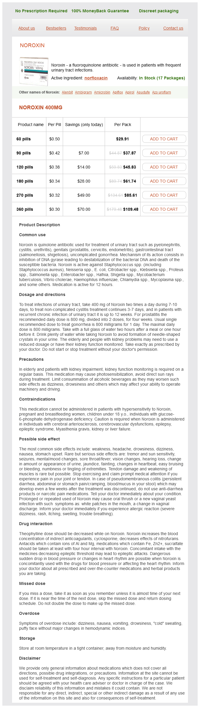 Norfloxacin packs: 60 pills, 90 pills, 120 pills, 180 pills, 270 pills, 360 pills